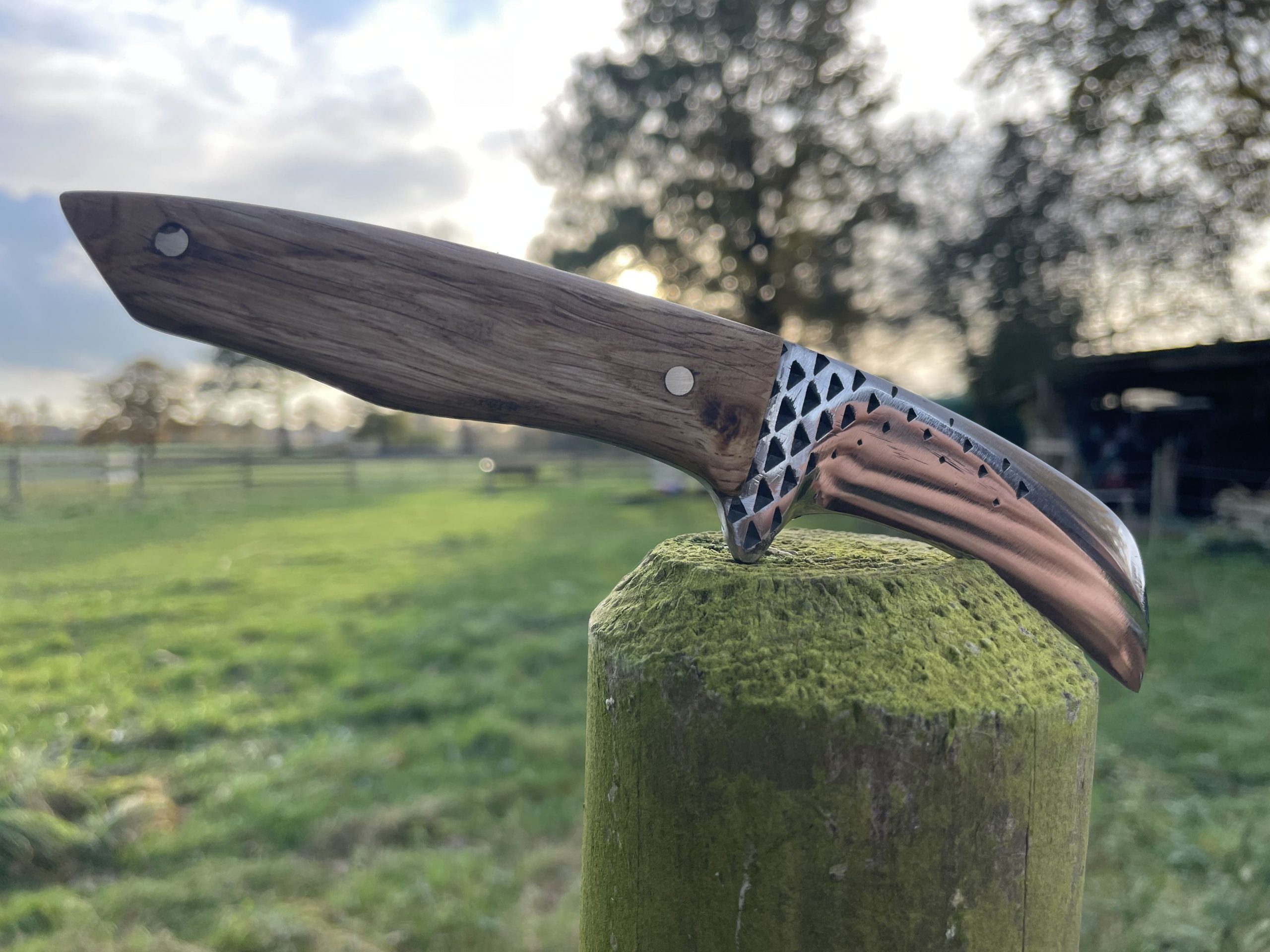 - Blade Form: Forged from high-carbon rasp steel, the blade features a unique, gentle curve culminating in a sturdy, slightly dulled point (the „Beak“). This design ensures the edge is accessible for fine carving and precise push-cuts, while the dulled tip allows for safer, versatile utility without compromising strength.